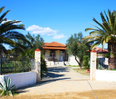 An einem der schönsten Landstriche Griechenlands liegt die Villa des Professors 2. Das ca. 1200 qm großes, umzäunte Grundstück liegt nur einen Steinwurf von der Blauen Lagune und dem feinen Sandstrand ca. 70m entfernt. An ruhigen Tagen kann man spielende Delphine in der blauen Lagune beobachten und sich an Ihren Kunststücken erfreuen. Zwischen alten Olivenbäumen und Palmen liegt die Villa des Professors 2.